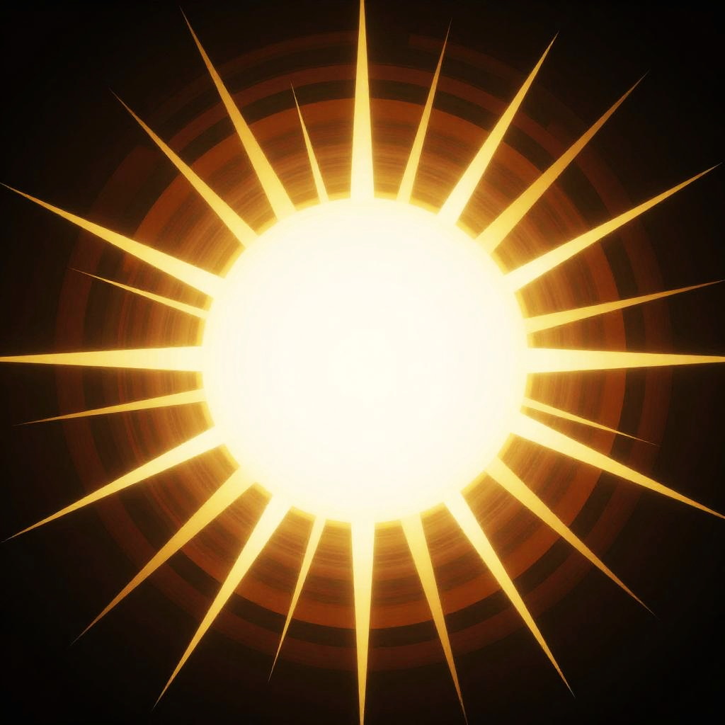 Bright, radiant sunburst with intense white center and yellow-orange rays, set against a dark, black background. Digital CGI image.