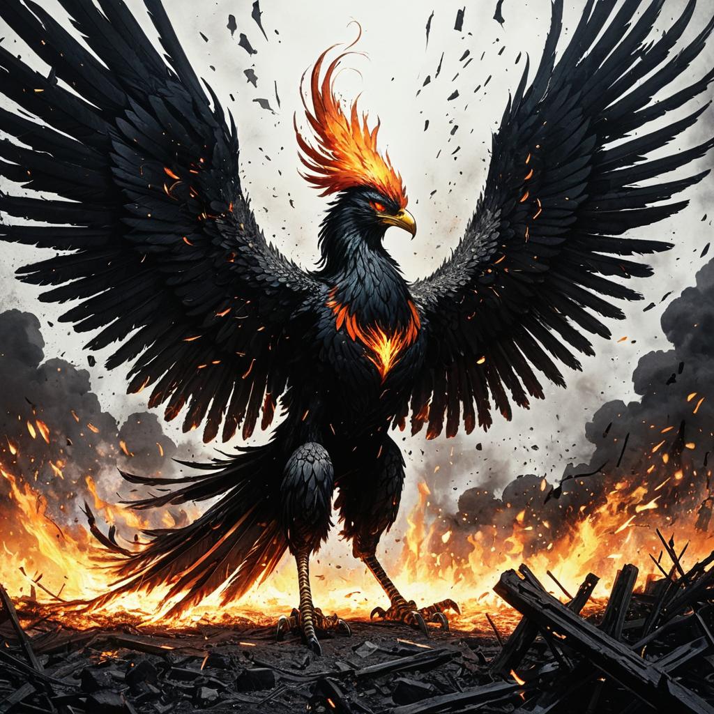 An elaborate phoenix rising from ashes in the woods, trending on ArtStation, 85mm, film, vibrant colors, digital art by Eyvind Earle, Jungsu Kim