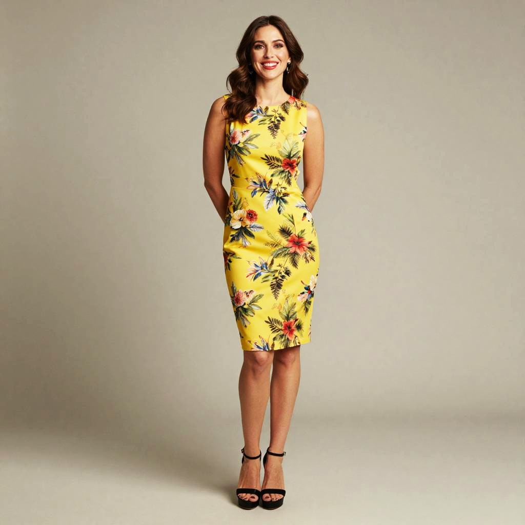 ((Masterpiece, best quality, edgQuality, photorealistic, hyper realistic)), smile--, edgGrk_woman, edgGrk_face, edgGrk_body, a woman posing for a picture, portrait, 1girl, solo, simple background, earrings, sleeveless, nail polish, black footwear, high heels, lips, sleeveless dress, arms behind back, floral print, sandals, toenail polish, yellow dress, print dress