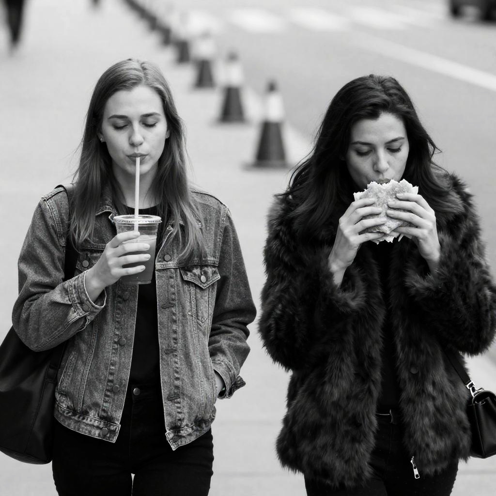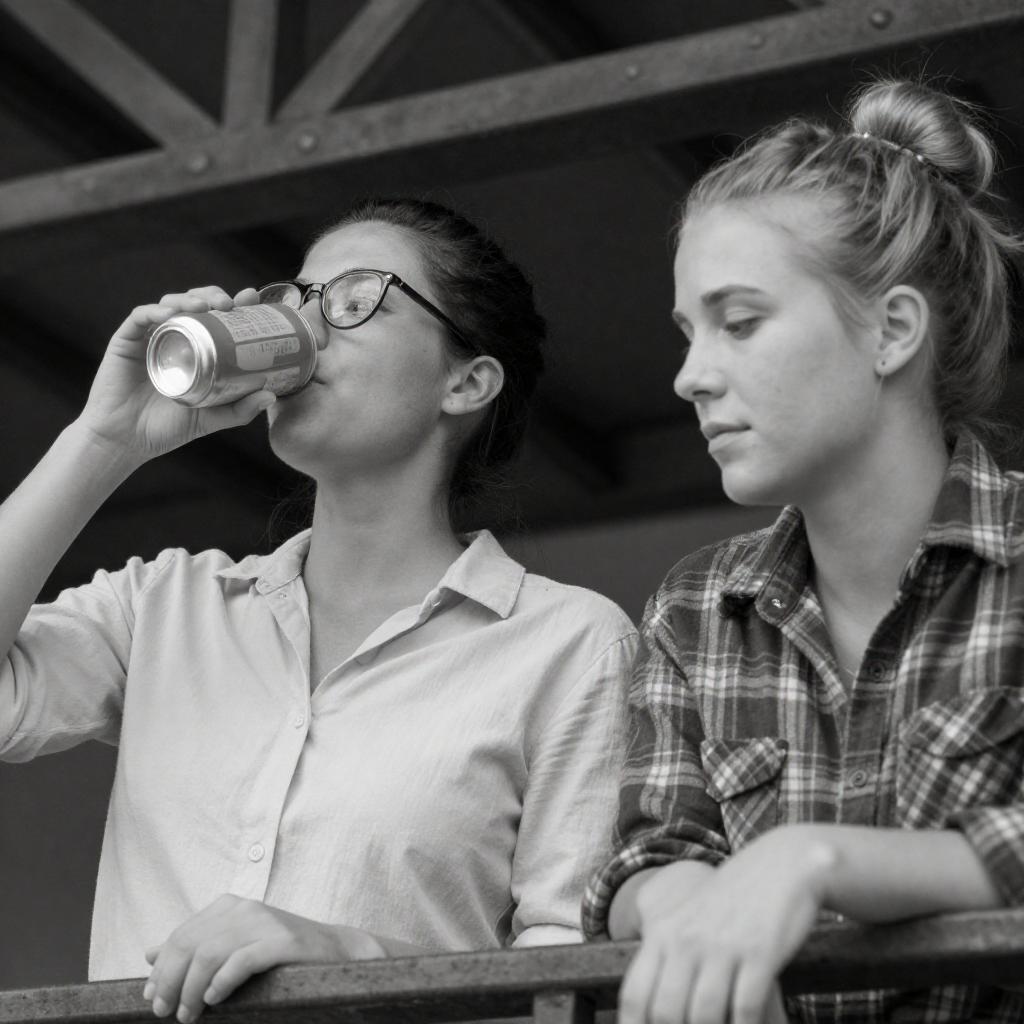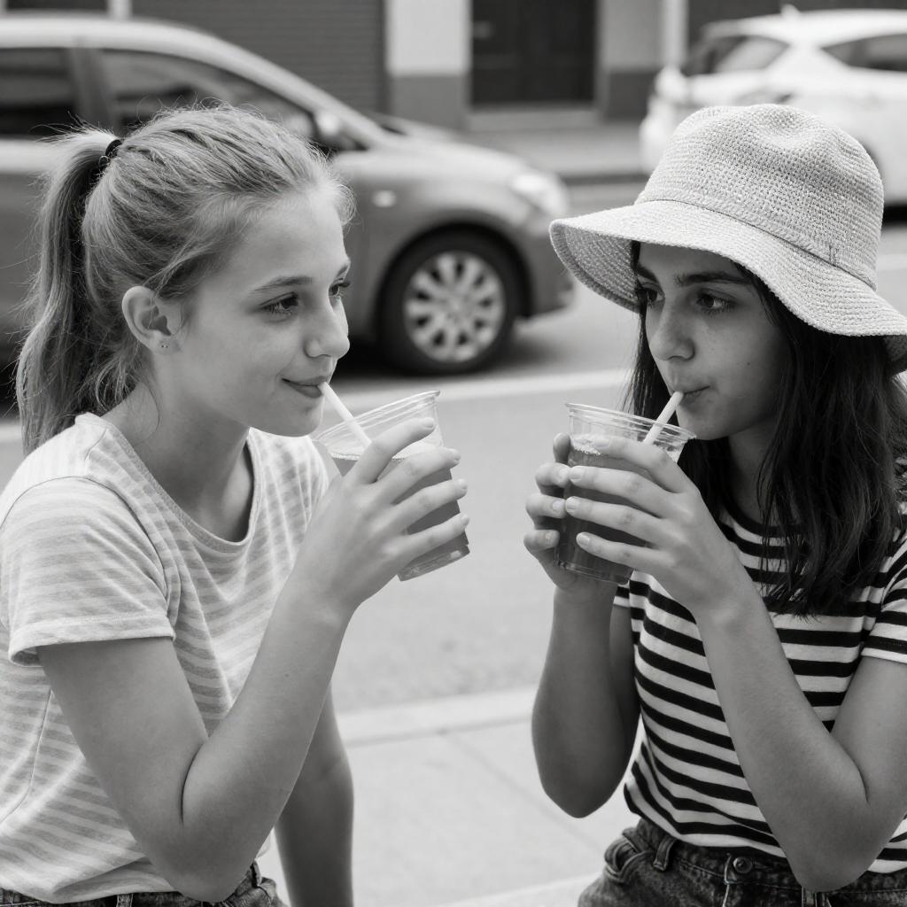 Black-and-white photograph of two young women sitting outdoors, sipping from plastic cups. The woman on the left has light hair in a ponytail, smiling, wearing a striped shirt. The woman on the right has dark hair, wearing a wide-brimmed hat and striped shirt, looking down. Background includes parked cars and a sidewalk.