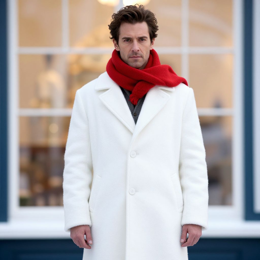 "White Christmas Movie Apparel, man in a white coat and red scarf standing in front of a window"