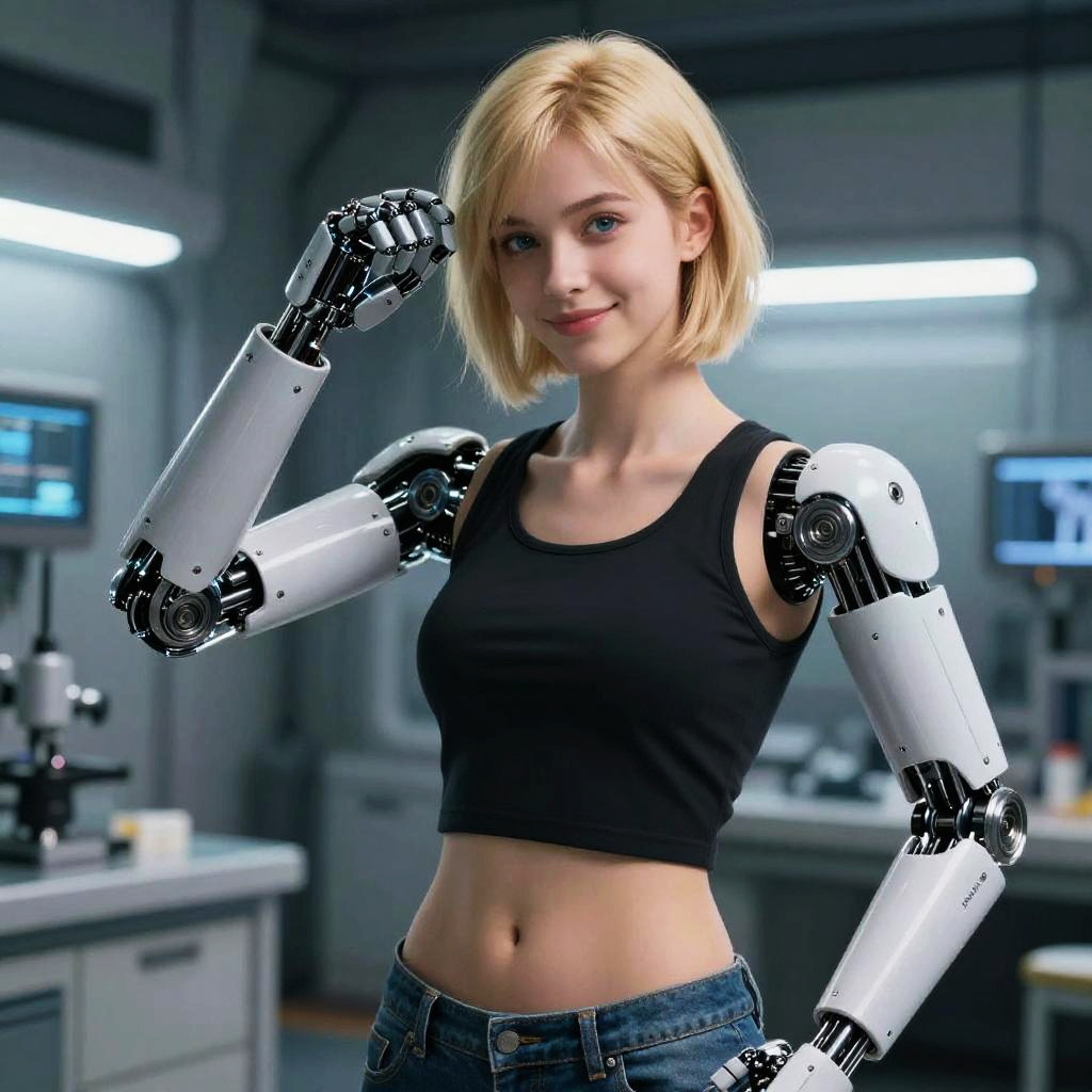 (highly detailed CG illustration), (8k, best quality, masterpiece:1.2), (realistic:1.3), (photorealistic:1.3), ultra-detailed, 1girl, (18 years old), blonde short hair, blue eyes, (robot arms and hands:1.3), machine made joints, (fabric black tank top), open navel, medium breast, visible shoulders, blue jeans, (high detailed skin:1.2), cute smile, uhd, dslr, soft lighting, high quality, film grain, Fujifilm XT3, beautiful lighting, cinematic lighting, inside futuristic lab