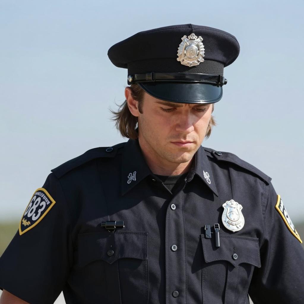 Photograph of a stern-faced white male police officer with long brown hair under a black peaked cap, wearing a black uniform with white numbers "683" on the shoulders. He is bending forward slightly, focusing downward. Blue sky background. Officer's nose is prominent, expression is serious. Cap has a silver badge. Upper body visible.
