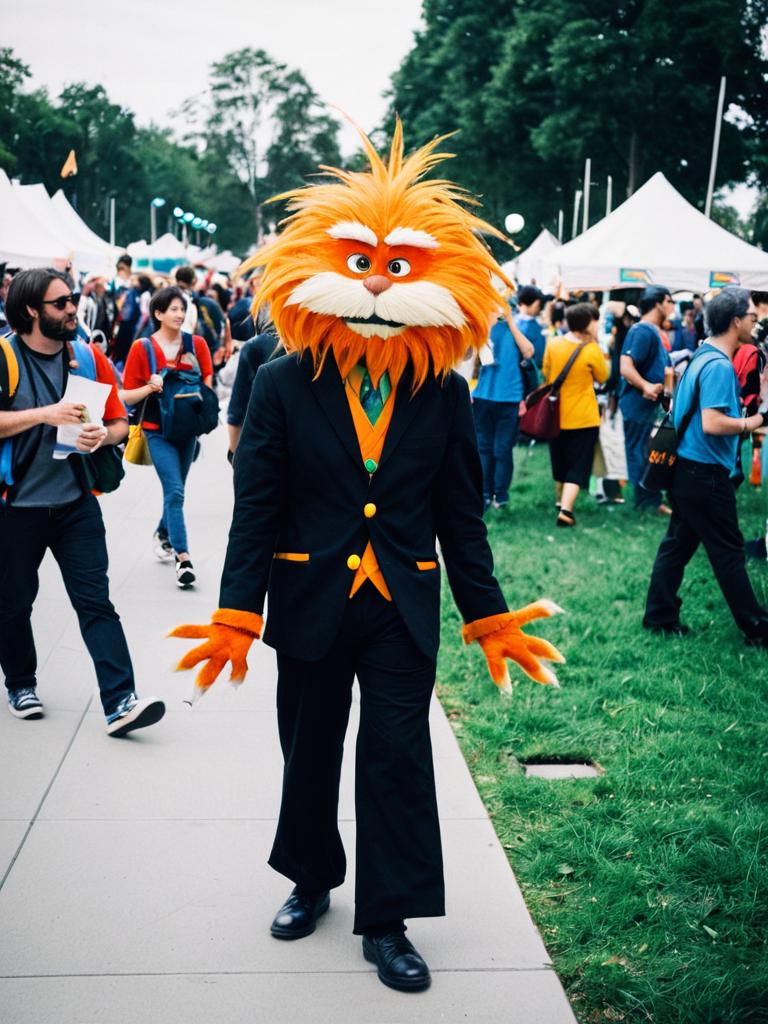 Person in Lorax Costume at Outdoor Cosplay Festival