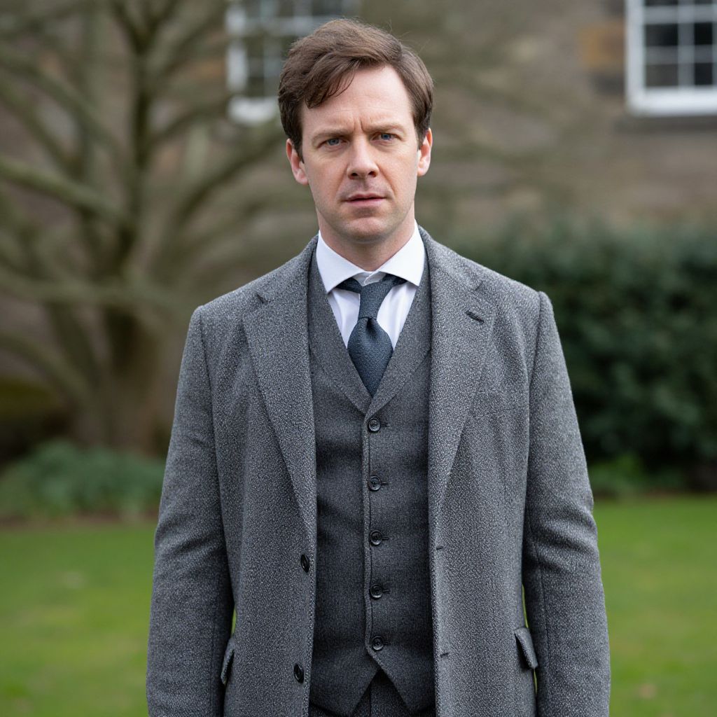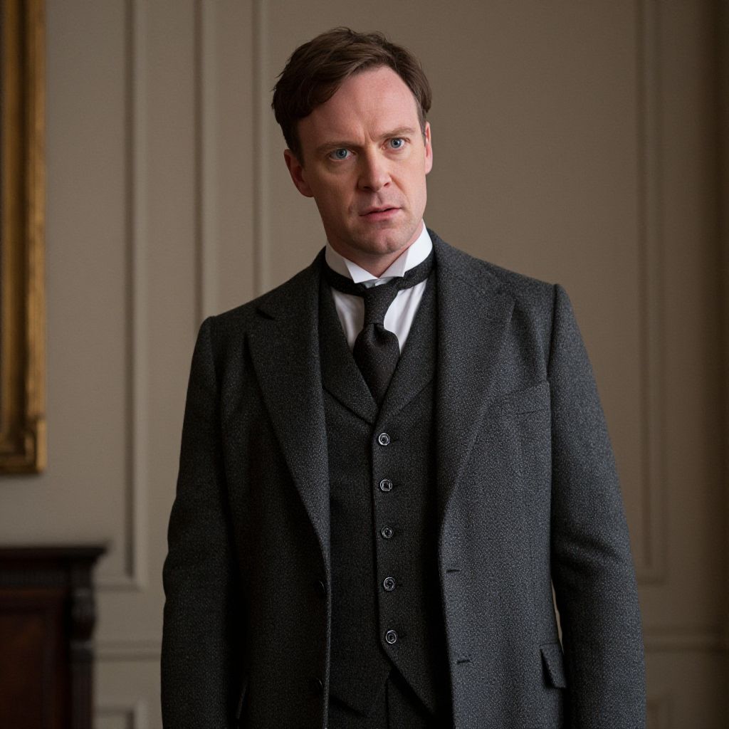 Photograph of a Caucasian man with short, dark brown hair and light blue eyes, standing indoors. He is wearing a dark gray, textured wool three-piece suit with a black bow tie and white shirt. His expression is serious and focused. The background features a cream-colored, paneled wall with a partial view of a gold-framed painting and a dark wooden piece of furniture on the left. The lighting is soft, highlighting the man's face and suit. The overall style is formal and classic, suggesting a historical or period setting.