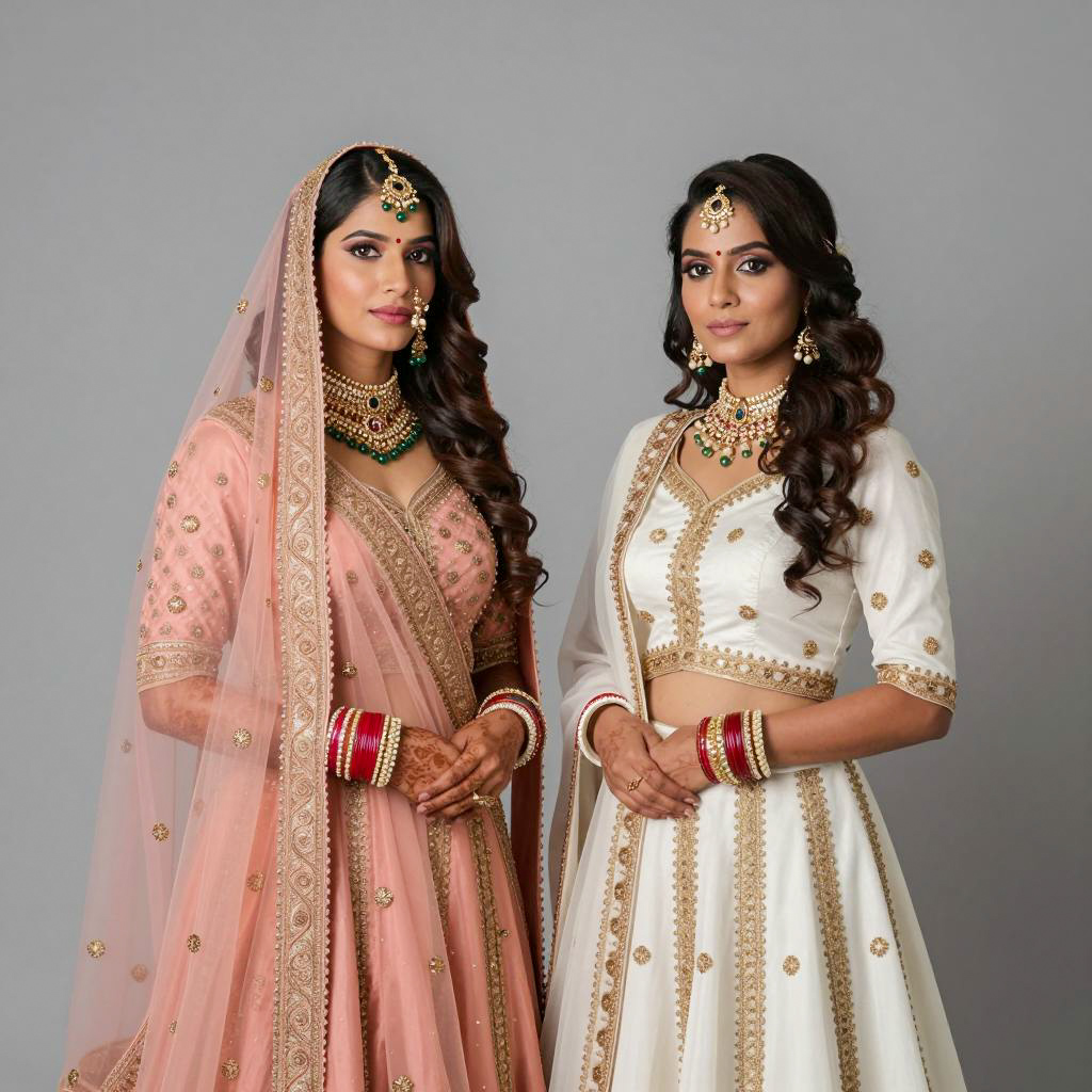 Brides brothers costume, photograph of two Indian women in traditional wedding attire, standing against plain gray background, left woman wearing peach-colored lehenga with gold embroidery and transparent veil, right woman wearing white lehenga with gold embroidery, both have dark hair in loose curls, wearing traditional jewelry including necklaces, earrings, and maang tikka, both women have neutral expression, arms crossed in front, light skin tone, minimalist background, soft lighting, bridal wear, Indian culture, traditional clothing, elegant, detailed embroidery
