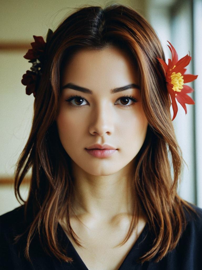 Female kirishima hero, 1girl, solo, realistic, brown hair, looking at viewer, hair ornament, upper body, indoors, closed mouth, hair flower, flower, blurry