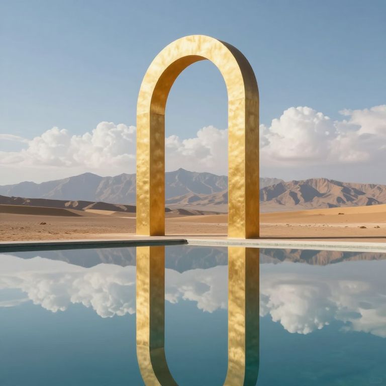 Golden arch standing in a desert landscape, reflected in a still, mirror-like pool under a clear blue sky with white clouds.