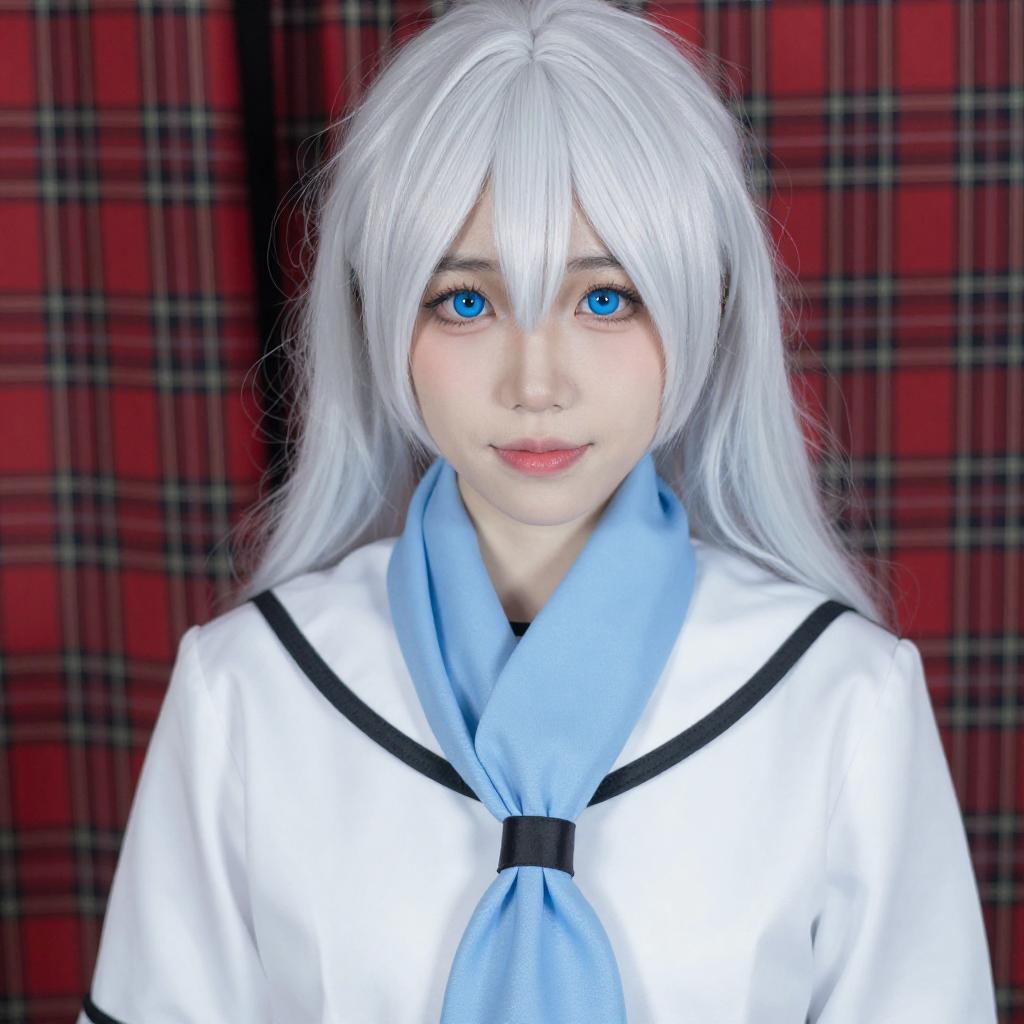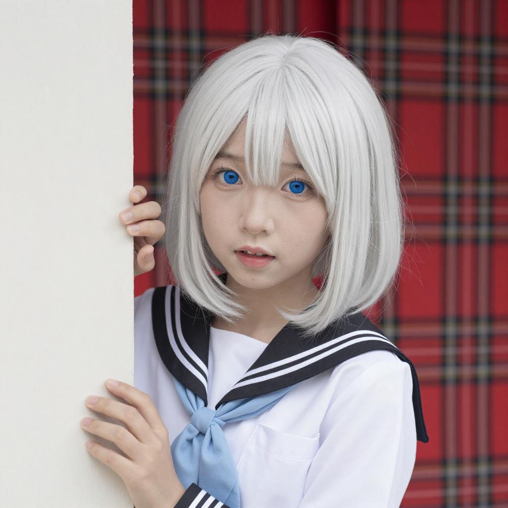 Photograph of a young child with pale skin and large blue eyes, wearing a white sailor-style outfit with black trim and a light blue scarf. They have straight, white, shoulder-length hair and are peeking around a corner with a playful expression. A red plaid curtain is in the background.