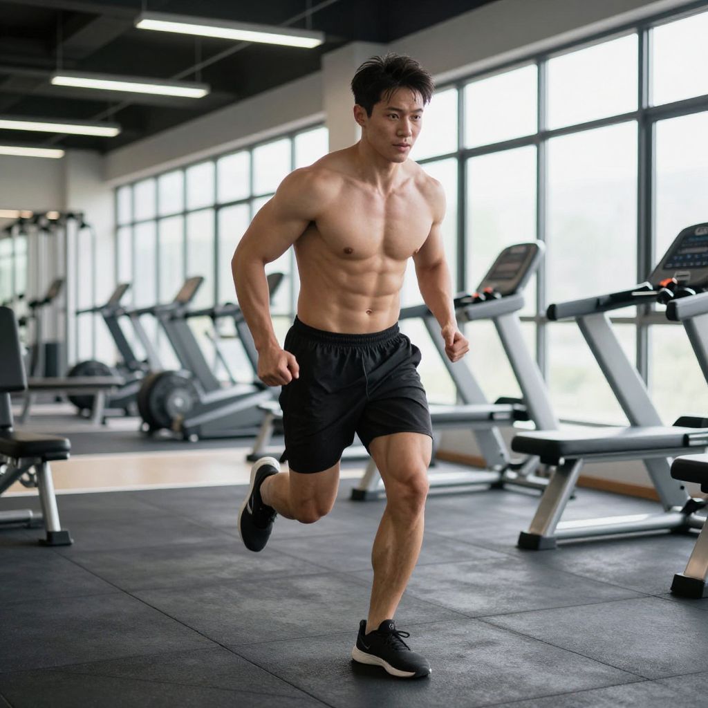 Photograph of a muscular, shirtless Asian man jogging in a modern gym, wearing black shorts and sneakers, with cardio machines in the background.