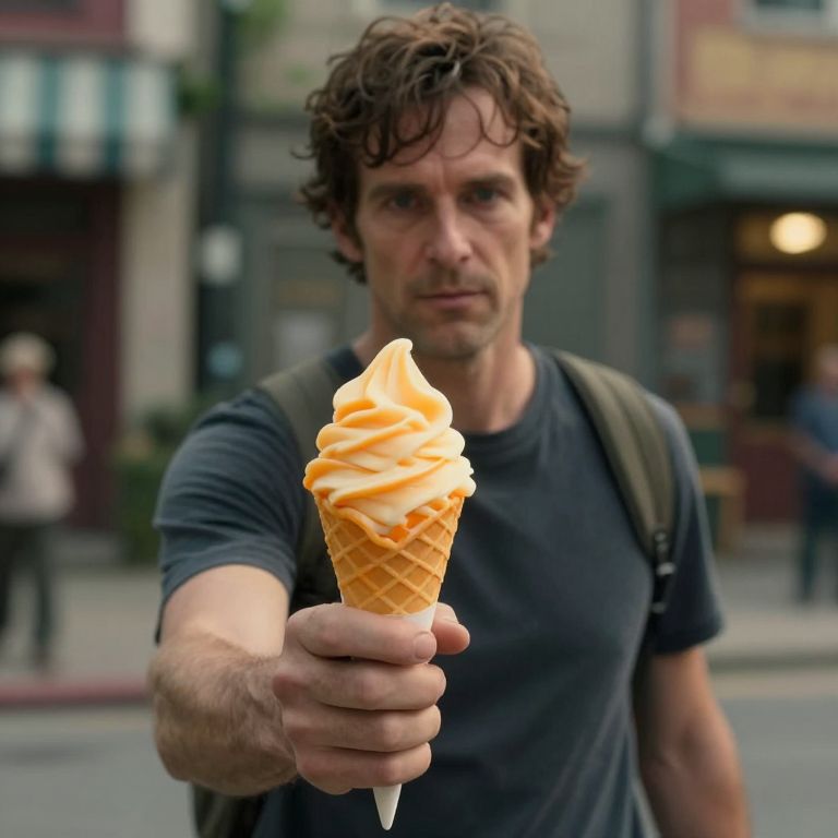 Photograph of a middle-aged man with curly brown hair and a serious expression, wearing a dark gray t-shirt and green backpack. He holds an orange swirl ice cream cone in his right hand, extending it towards the camera. The background is slightly blurred, showing a street with buildings, a shop window, and a person walking. The ice cream is prominently in the foreground, with the man's face and upper body in focus. The overall color palette includes earthy tones and the vibrant orange of the ice cream. The image has a shallow depth of field, emphasizing the ice cream and the man's face.