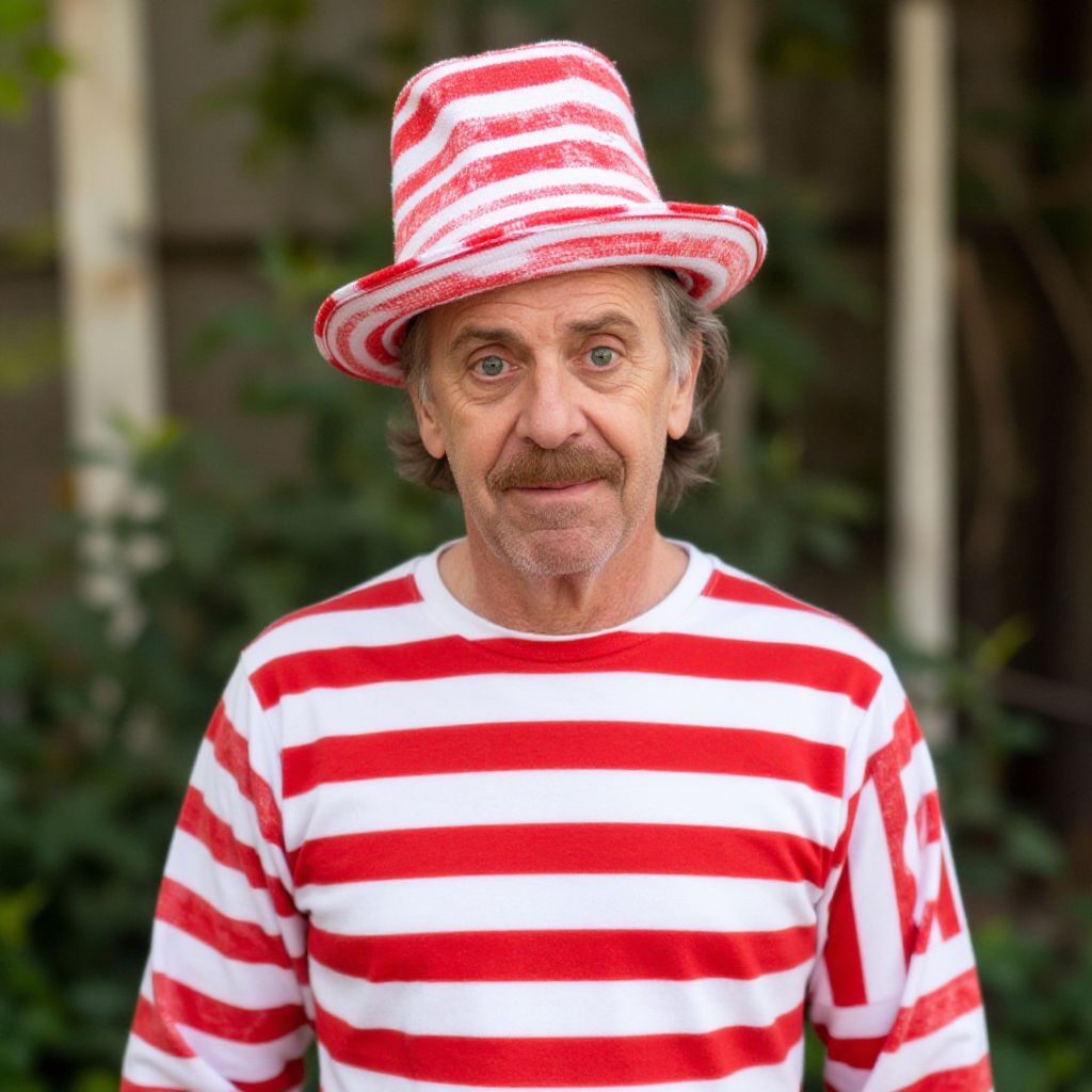 "Uncle Fester Fancy Dress Costume, dressed in a red and white striped shirt and hat"