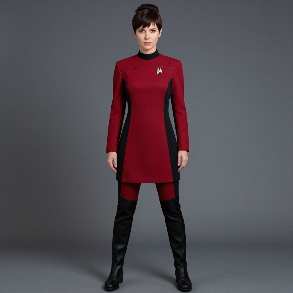Photograph of a short-haired woman standing against a gray gradient background. She wears a form-fitting, long-sleeve, red dress with black side panels and a small, white Starfleet insignia on the left chest. Her attire is complemented by black, knee-high boots. She has a fair skin tone and a serious expression. The dress has a high neckline and the fabric appears smooth and slightly glossy. The overall style is reminiscent of Star Trek uniforms, with a modern, sleek twist. The lighting is even, highlighting the colors and textures of her outfit.