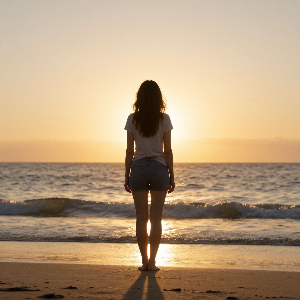 Embracing a newfound sense of freedom and renewal, a woman stands barefoot on the shore, her silhouette bathed in the golden embrace of the setting sun, as the ocean whispers tales of hope and healing.