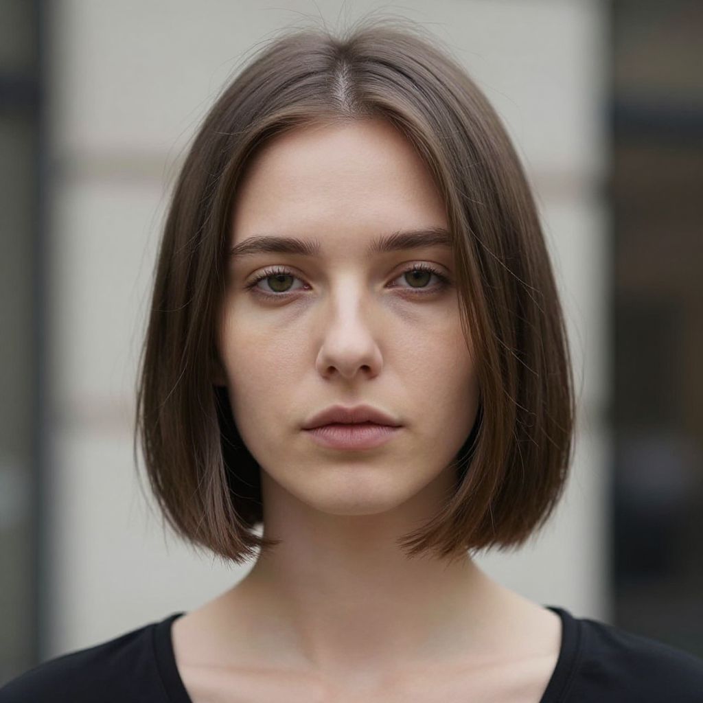 Caucasian woman with soft blunt cut and side part hairstyle, minimalist edgy style, balanced symmetry, subtle contrast between smooth hair and defined edges, calm expression, natural hair texture, urban setting with soft shadows, representing quiet strength and modern elegance.