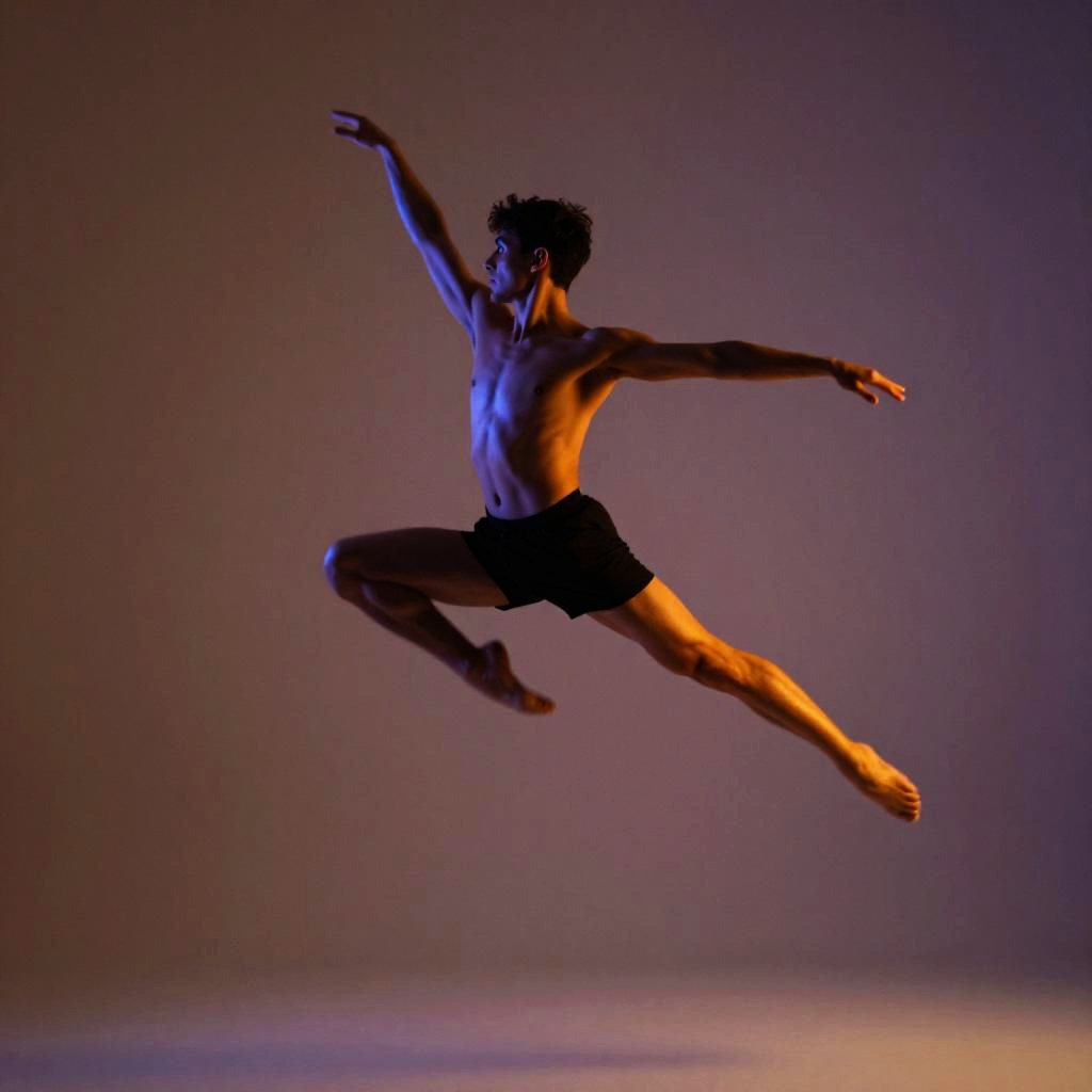 Full body pose of a male dancer mid-leap, motion blur effect, dramatic studio lighting, vibrant background, athletic physique, contemporary art style