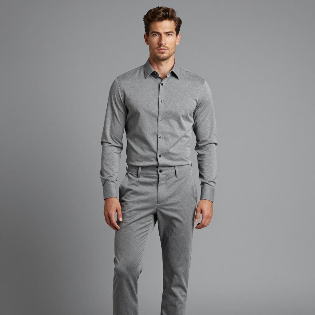 Silver pants halloween, photograph of a young man, standing, full body, looking at camera, light skin, short brown hair, slight mustache, wearing shiny silver satin shirt and pants, long sleeves, buttoned shirt, belt visible, neutral expression, plain gray background, soft lighting, contemporary fashion, realistic style, portrait, close-up, modern clothing, high contrast, minimalistic background