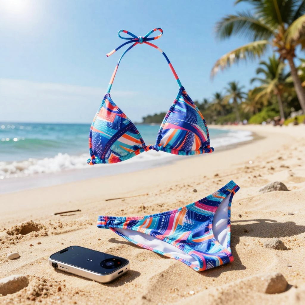 Photograph of colorful, wavy-patterned bikini top and bottom on sunny beach, smartphone with circular ring on sand, ocean waves, and palm trees