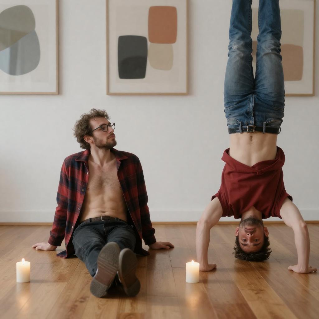 Photograph of two men in a room with wooden floors. One man, shirtless with glasses and a red plaid jacket, sits on the floor, while the other, upside down with his head near the floor, wears a red shirt and jeans. Two lit candles are on the floor, and abstract paintings hang on the white wall behind them.