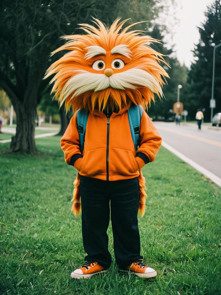 Man in Lorax Costume, photorealistic outdoor portrait in natural daylight