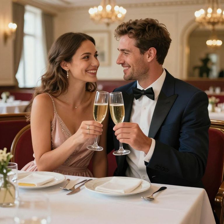 Photograph of a smiling couple in formal attire, raising champagne glasses in an elegant, warmly lit restaurant. She wears a pink dress, he a black