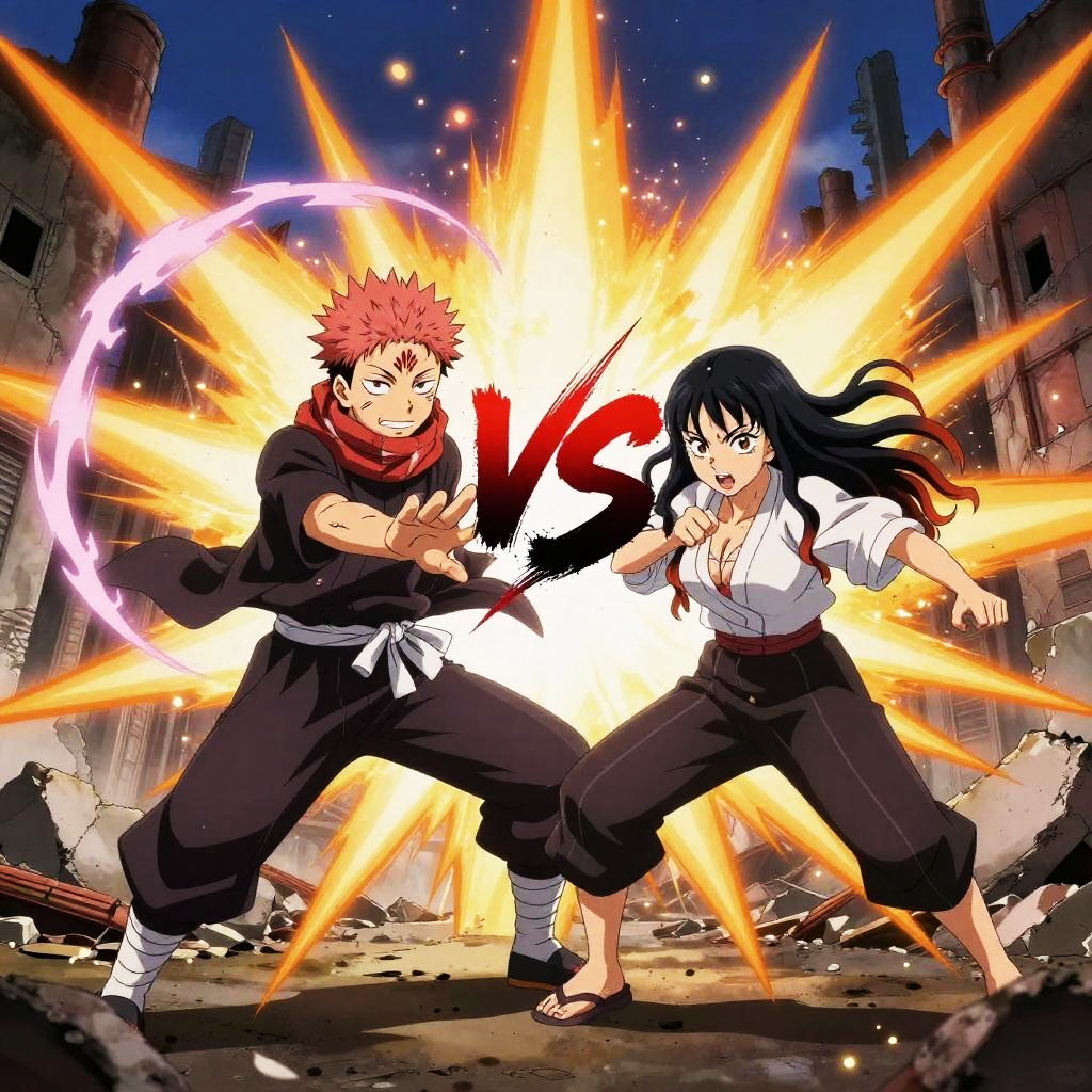 Epic showdown Sukuna vs Megumi in a ruined city, vibrant colors, powerful curses unleashed, dynamic poses, anime-inspired, explosive energy effects, cinematic atmosphere