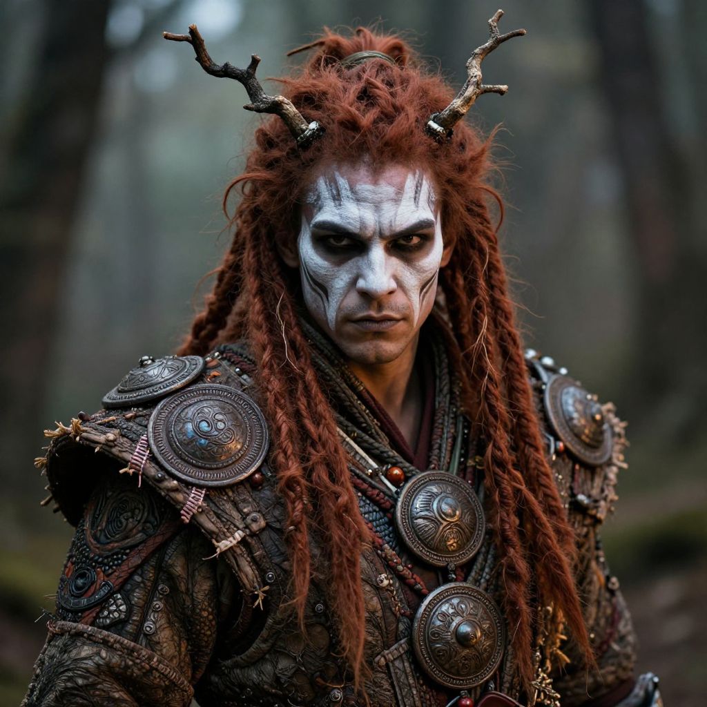 Photograph of a male character with pale, white-painted face and striking black markings resembling tribal or ceremonial makeup. He has long, wild, red dreadlocks adorned with twisted, horn-like branches. He wears a dark, ornate armor with intricate, metallic round plates and spikes, set against a blurred, forested background. His intense, shadowed eyes and stern expression add a sense of mystery and power. The overall style is reminiscent of fantasy or fantasy-themed cosplay, with a dark, mystical, and otherworldly aesthetic.