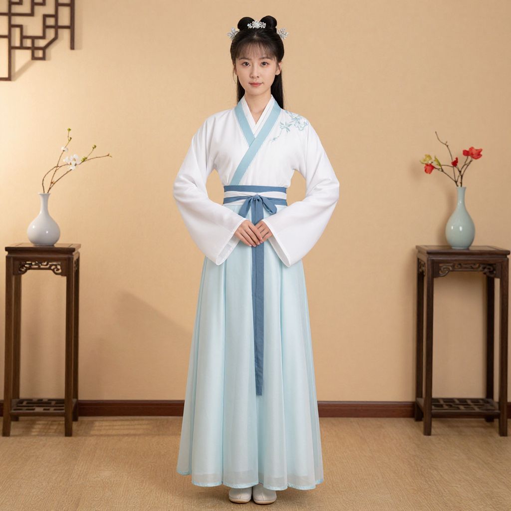 Photograph of an East Asian woman in traditional white and light blue hanbok, standing in a minimalist room with beige walls, wooden tables, and