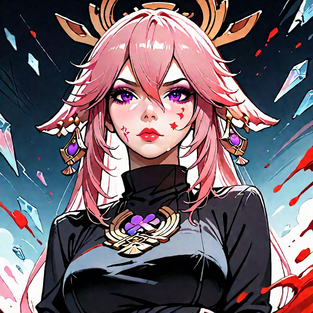 Score_9, score_8_up, score_7_up, source_anime, 1girl, IncrsXLBrknGls, broken glass, reflection, upper body, yae miko, black dress, blood, blood on face, blood on clothes, blood on glass, serious