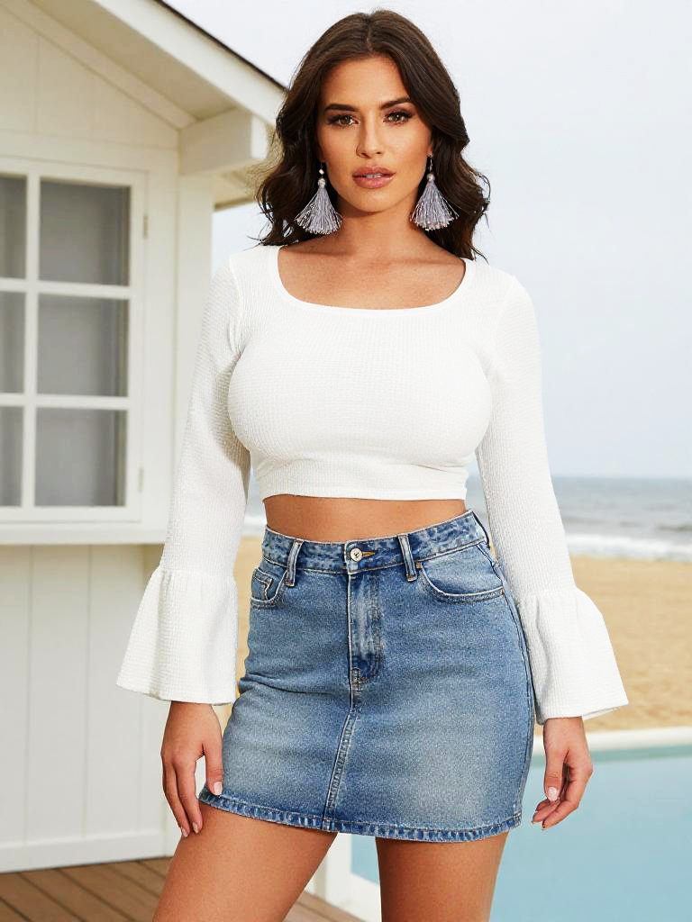A woman, in a white crop top and flared mini skirt, vibrant colors, holding a yellow clutch, set against a seaside picnic setup, visual style: cinecolor. Sexy. Pretty face and beаutiful eyes. Big breasts