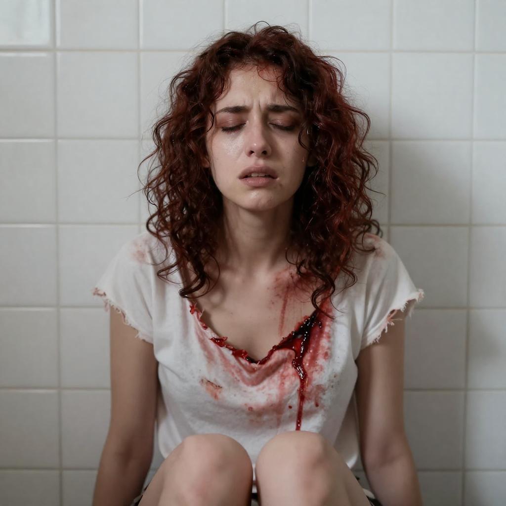 Distressed Woman with Bloodied Clothes Sitting Against Tiled Wall