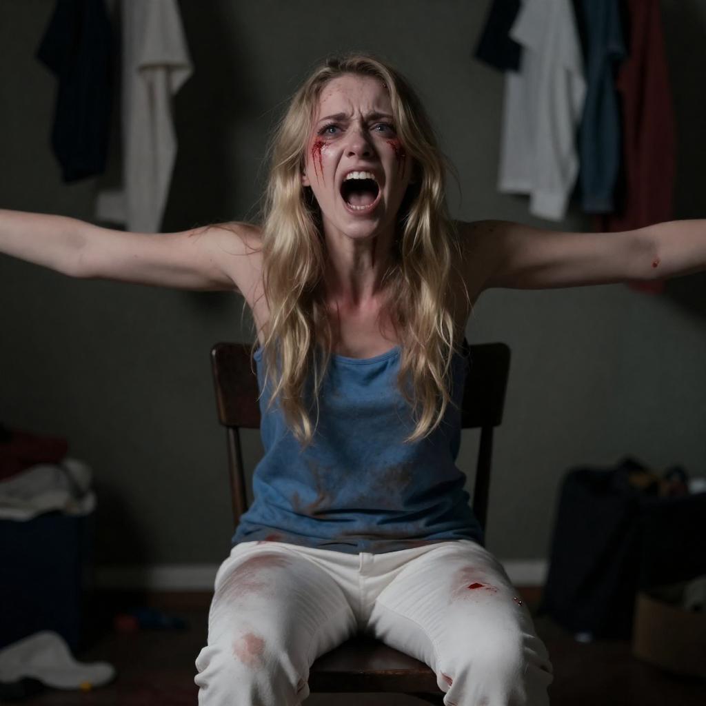 A young woman with curly hair and a pale complexion sits with her eyes closed against a white tiled wall. She is wearing a torn white t-shirt stained with blood on the chest and arms. Her facial expression conveys pain and distress. The setting suggests a stark, clinical environment with visible blood stains on the tiles behind her.