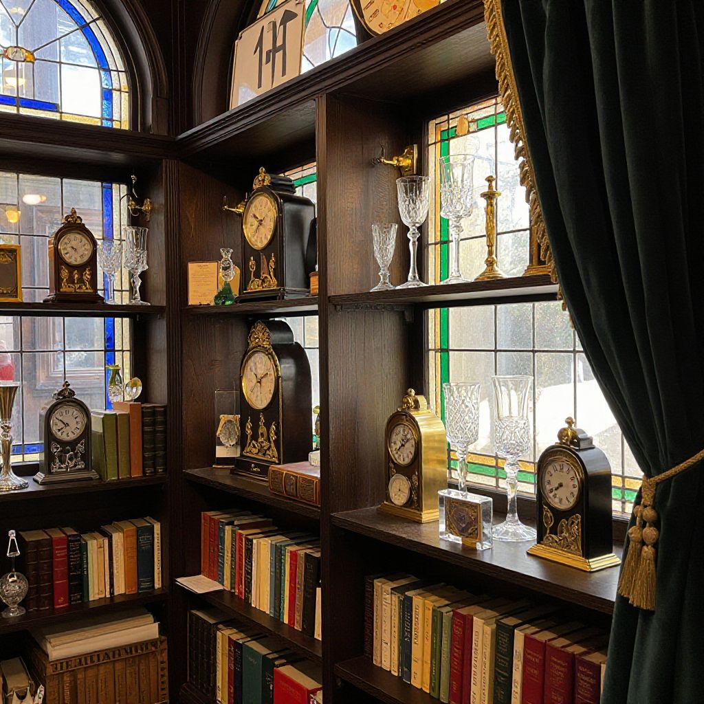 Emporium interior showcasing an elegant vintage shop, shelves lined with rare books, antique clocks, and shimmering glassware, soft sunlight filtering through stained glass windows, a cozy yet luxurious ambiance with velvet drapes and brass fixtures.