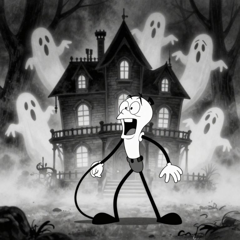 This black-and-white digital cartoon illustration features a startled, anthropomorphic character with a white face, black limbs, and large, expressive eyes, standing in front of a spooky, gothic-style haunted house. The character has an exaggerated open-mouth expression and is holding a long, thin object in his right hand. Surrounding the house are several floating, white, ghostly figures with simple, round eyes and mouths. The house has arched windows and a prominent staircase leading to the front door. The background includes dark, leafless trees and fog, enhancing the eerie atmosphere. The overall style is reminiscent of classic animated cartoons with bold, high-contrast lines and a spooky Halloween theme.