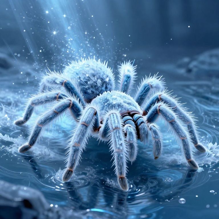 In the frozen wastes of Antartica, a striking scene unfolds. A large, metallic spider with eight legs and a segmented body stands prominently in the foreground. Its legs are long and slender, ending in sharp, pointed claws. The spider's body is intricately detailed, with a shiny, reflective surface that catches the light. A large, blue, cracked egg sits atop the spider's back, its surface shimmering with a web-like pattern. The egg's vibrant blue color contrasts sharply with the spider's metallic sheen. Surrounding the spider are several smooth, round rocks, scattered randomly across the icy terrain. The rocks vary in size and shape, some larger than others, and they add a sense of depth and texture to the scene. The overall composition is balanced, with the spider and egg as the central focus, while the rocks provide a grounding element in the foreground. The interplay of colors, textures, and shapes creates a visually captivating and dynamic image, evoking a sense of cold, harsh beauty in the frozen landscape.