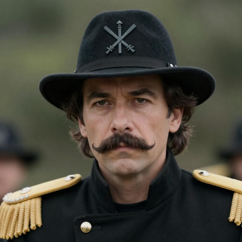 Portrait of a middle-aged man with wavy brown hair and a thick curled mustache, wearing a black felt hat adorned with a crossed sword emblem. He is dressed in a black military-style jacket with yellow epaulets and gold buttons, standing against a blurred natural green background. The man's intense facial expression adds to the vintage military look.