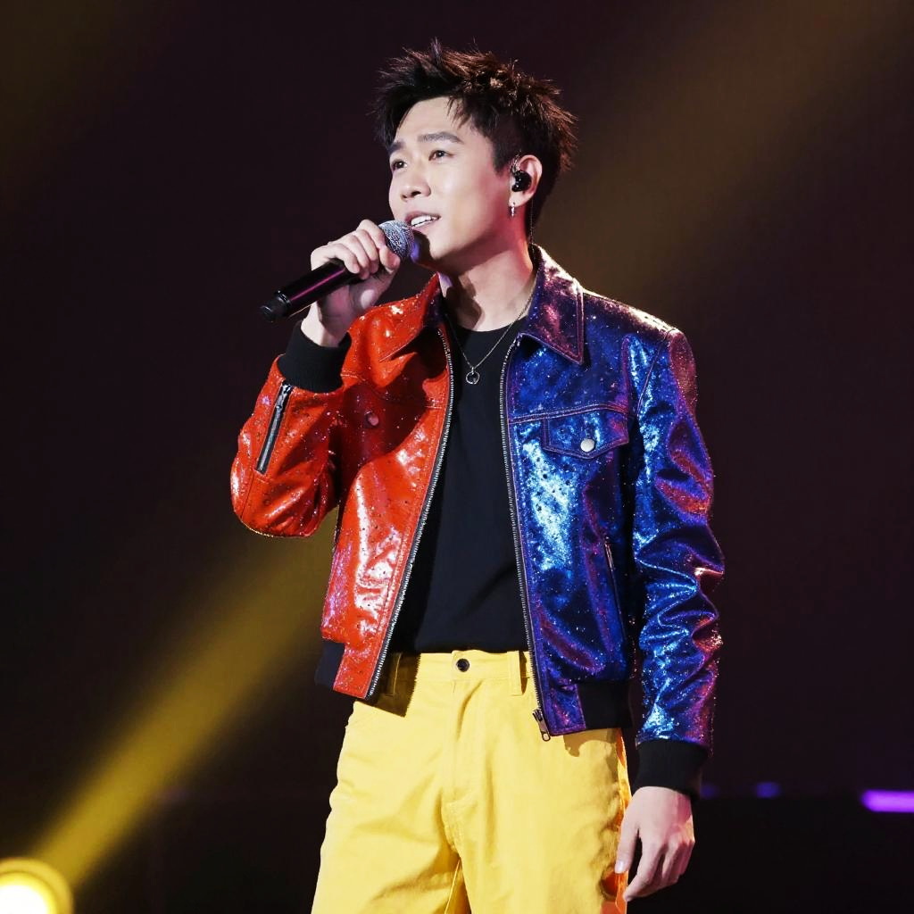 Photograph of an Asian male singer performing on stage. He has short, spiky black hair and is holding a microphone to his mouth with his right hand. He is wearing a shiny, red and blue leather jacket with a black shirt underneath, and bright yellow high-waisted pants. The background is dark with stage lights creating a yellowish glow. The singer's expression is focused, and he appears to be mid-song. His outfit contrasts sharply with the dark background, making his colorful jacket and yellow pants stand out prominently.
