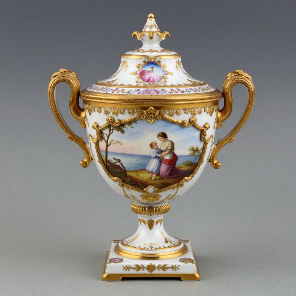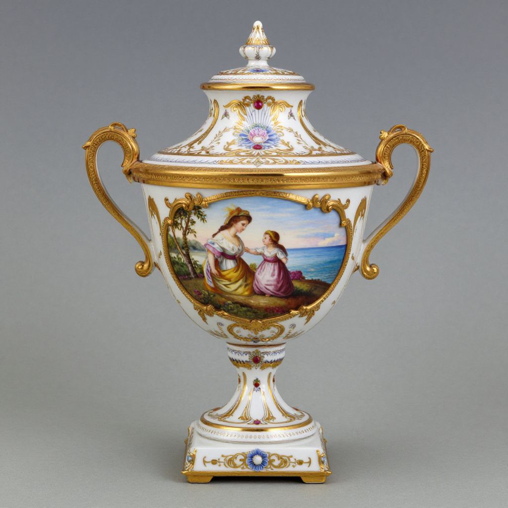 Ornate porcelain vase with gold accents, intricate floral and landscape painting, depicting a woman in a pink dress by the sea, against a gradient gray
