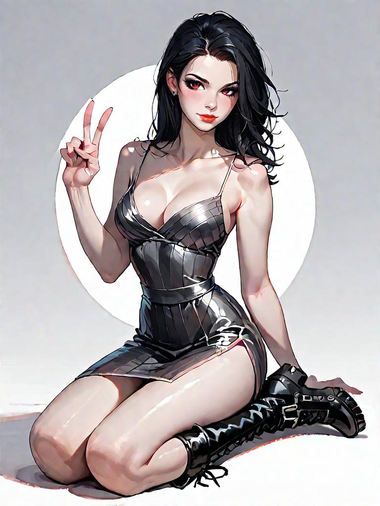 1girl, source_comics, realistic face, full body shot, Woman, casual chic, little black dress with a skater skirt silhouette, spaghetti straps, V-neckline, fitted bodice, flared above-the-knee skirt, peep-toe heeled booties, delicate pendant necklace, thin bracelet, white backdrop in a bright indoor setting.