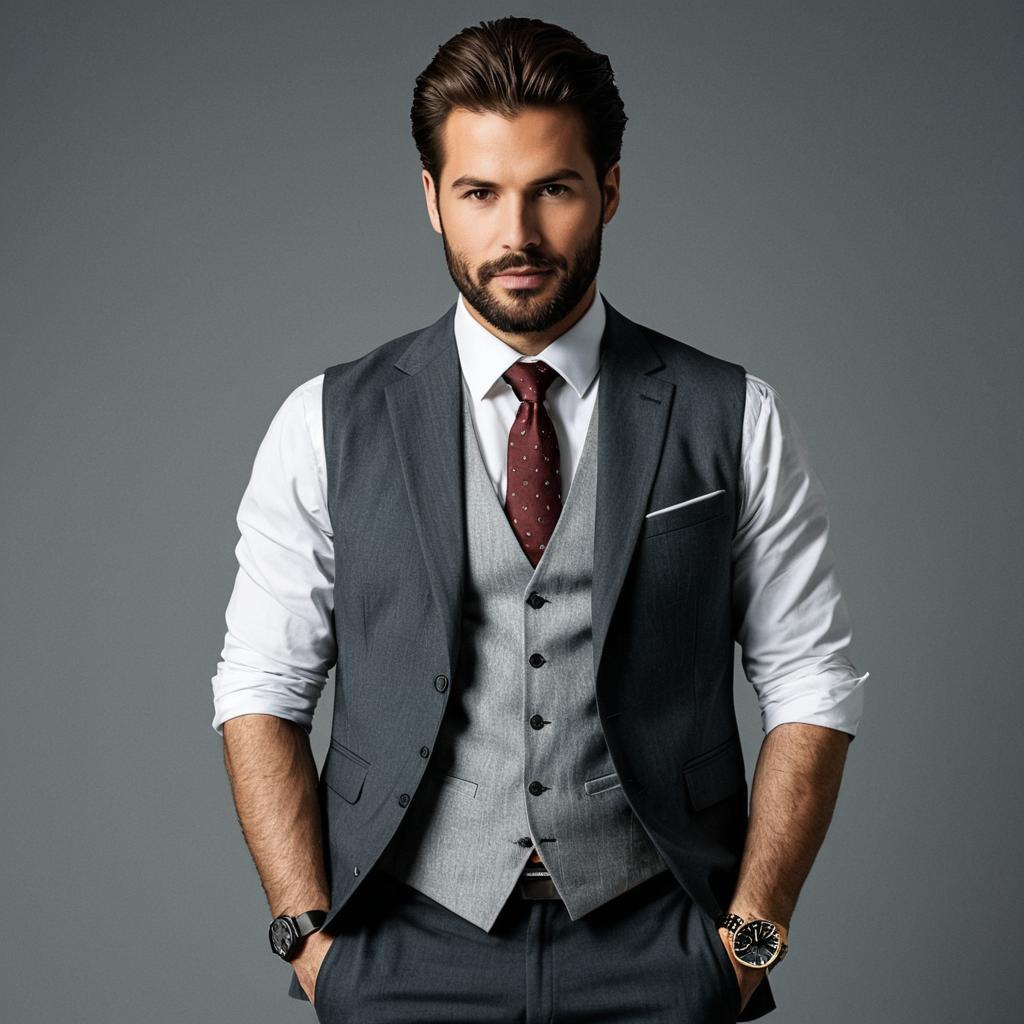Money heist costume man ,1boy, male focus, solo, necktie, watch, realistic, wristwatch, vest, brown hair, facial hair, shirt, formal, hand in pocket, suit, looking at viewer, white shirt, pants, jacket, beard, grey vest, manly, collared shirt, closed mouth, black pants