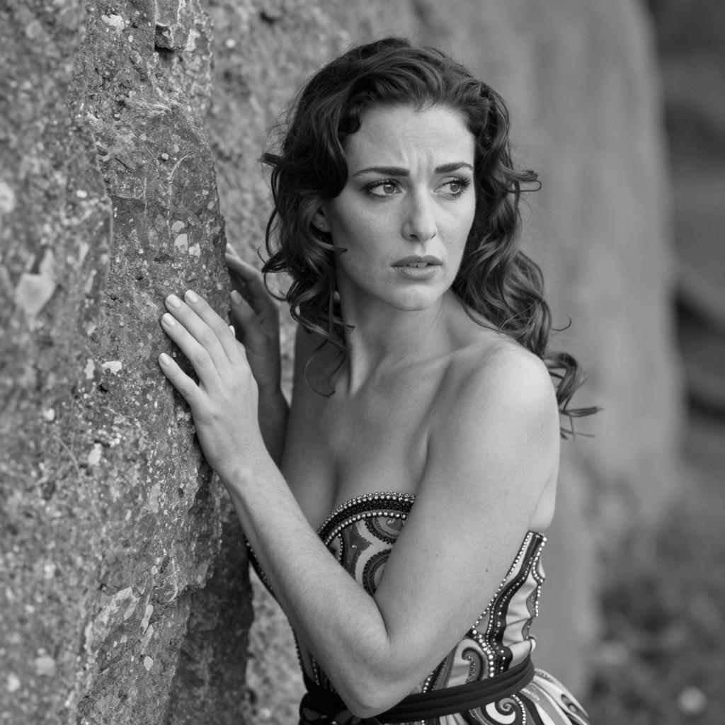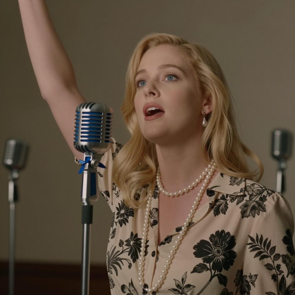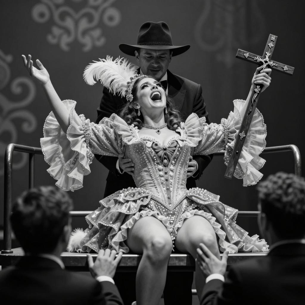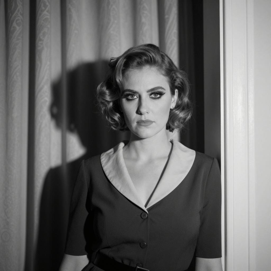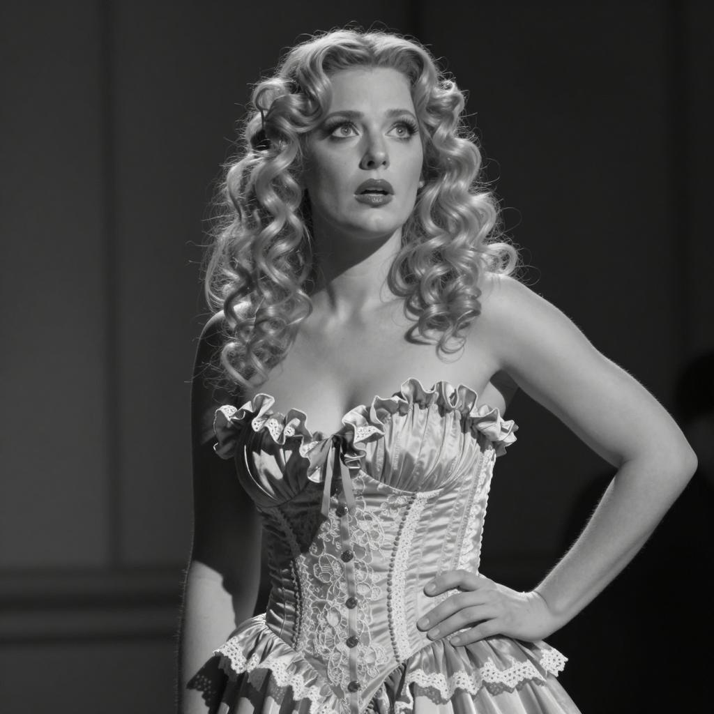 Black and white photograph of a woman with curly blonde hair, looking upward with a surprised expression. She wears a strapless dress with ruffled fabric and lace detailing, one hand on her hip. Dark, blurry background.