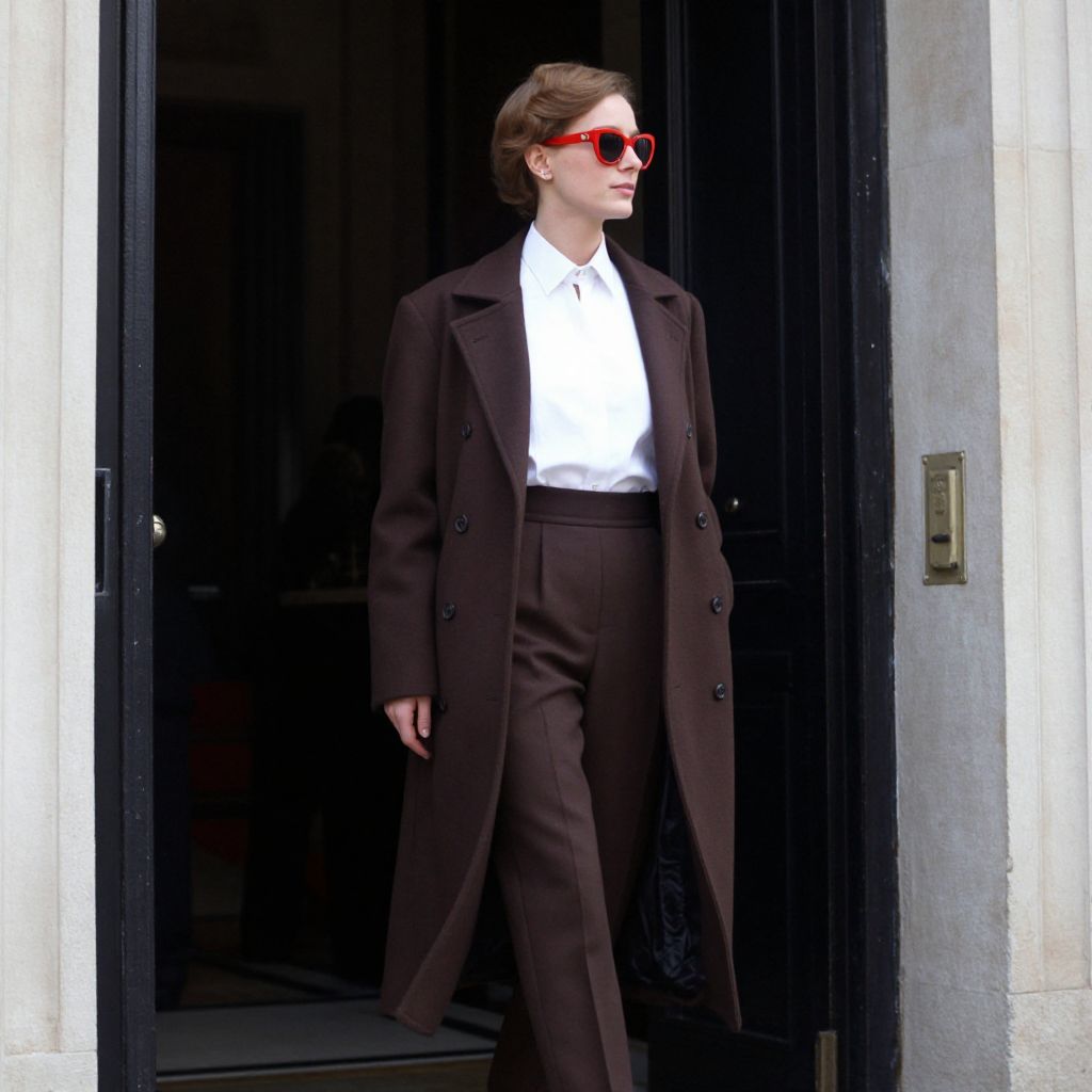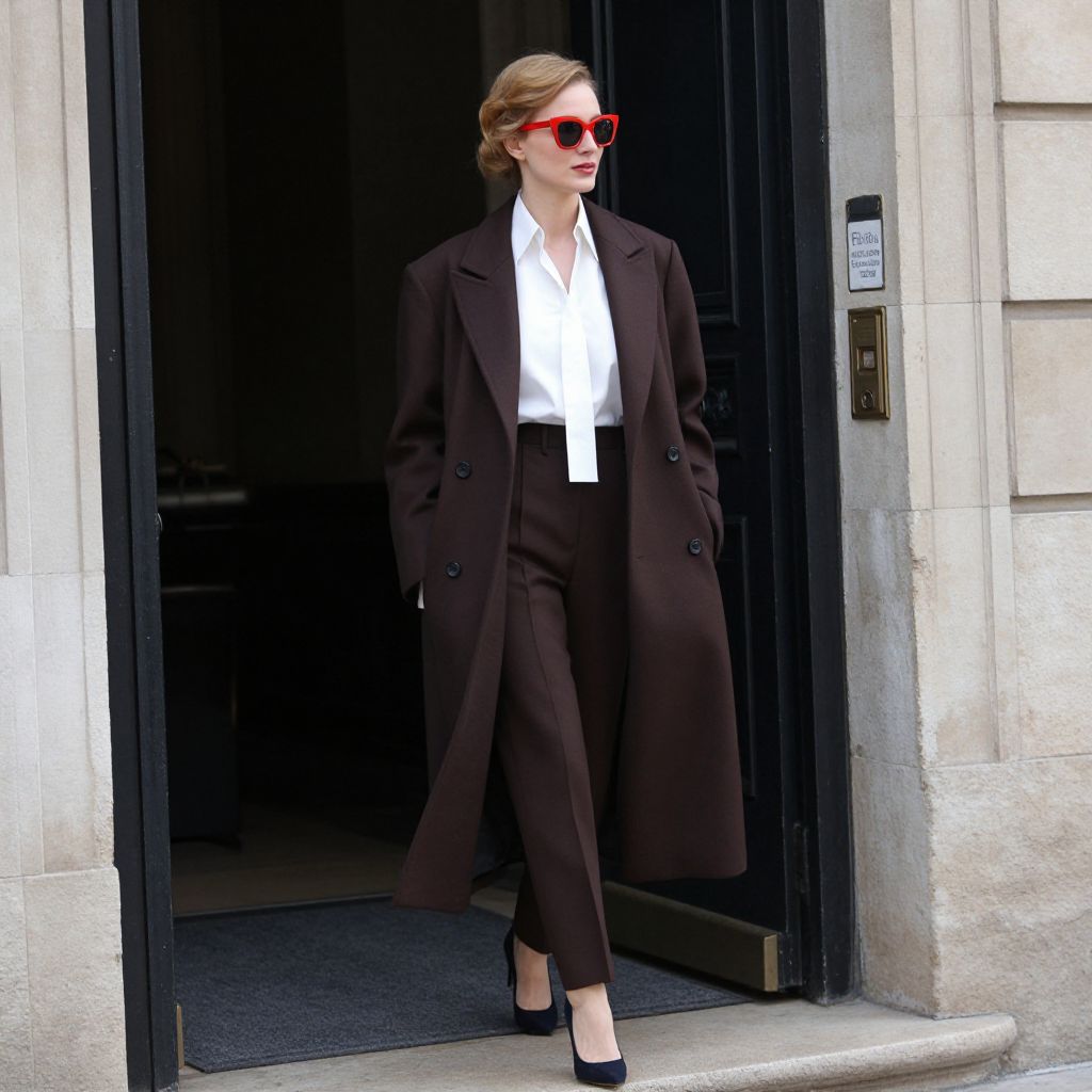 Elegantly poised woman exiting a grand doorway, donning a sophisticated brown and white ensemble featuring a tailored coat, crisp white shirt, and matching trousers, complemented by bold red accessories and sunglasses, embodying the timeless style of the House of Balenciaga, 1952. Repinned by le www.castingparisien.com.