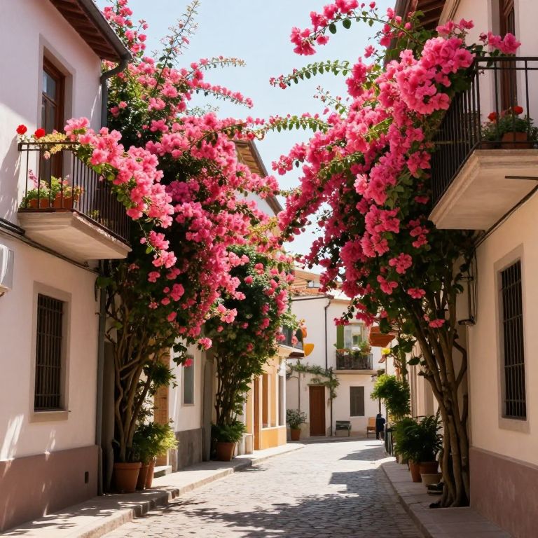 Vibrant pink flowers cascade from windows and balconies along a cobblestone alley, creating a living tapestry that transforms the urban landscape into a lush, floral corridor bathed in sunlight.