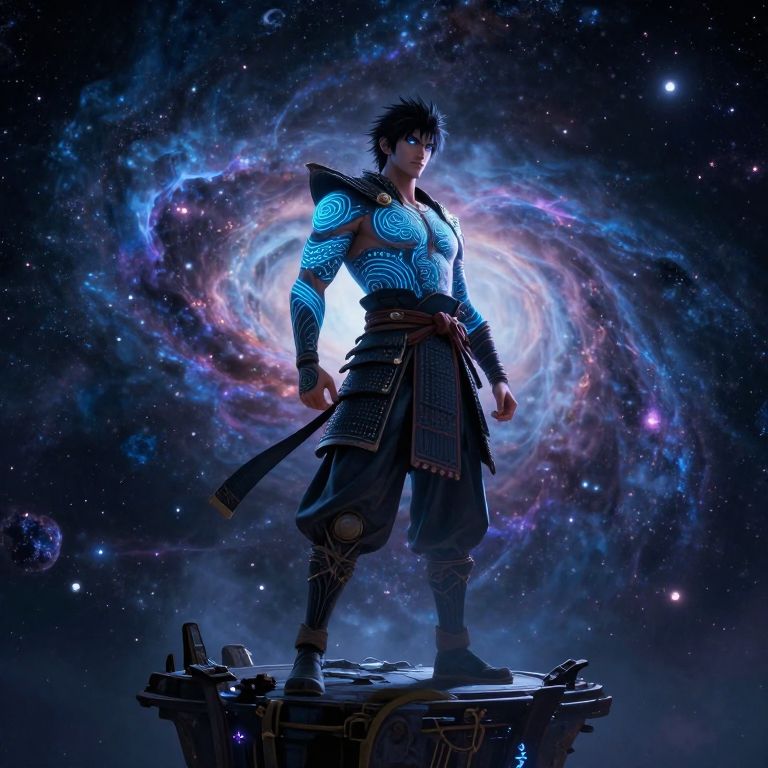 Digital artwork of a muscular, black-haired warrior with glowing blue tattoos, standing on a floating platform, against a swirling galaxy background.