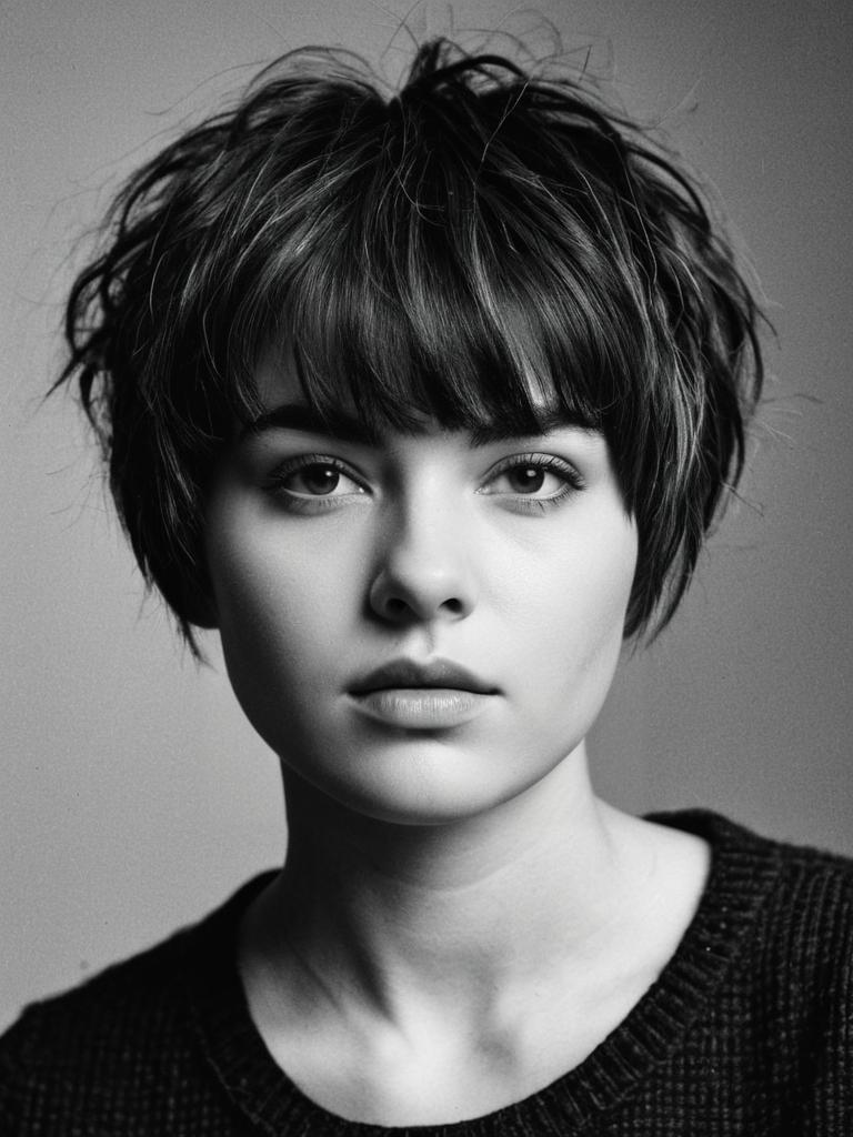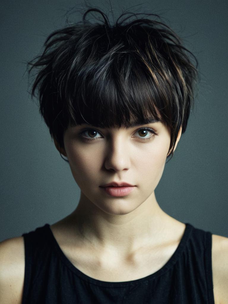 Woman with Messy Pixie Cut and Bangs hairstyle, photorealistic fashion-style photo