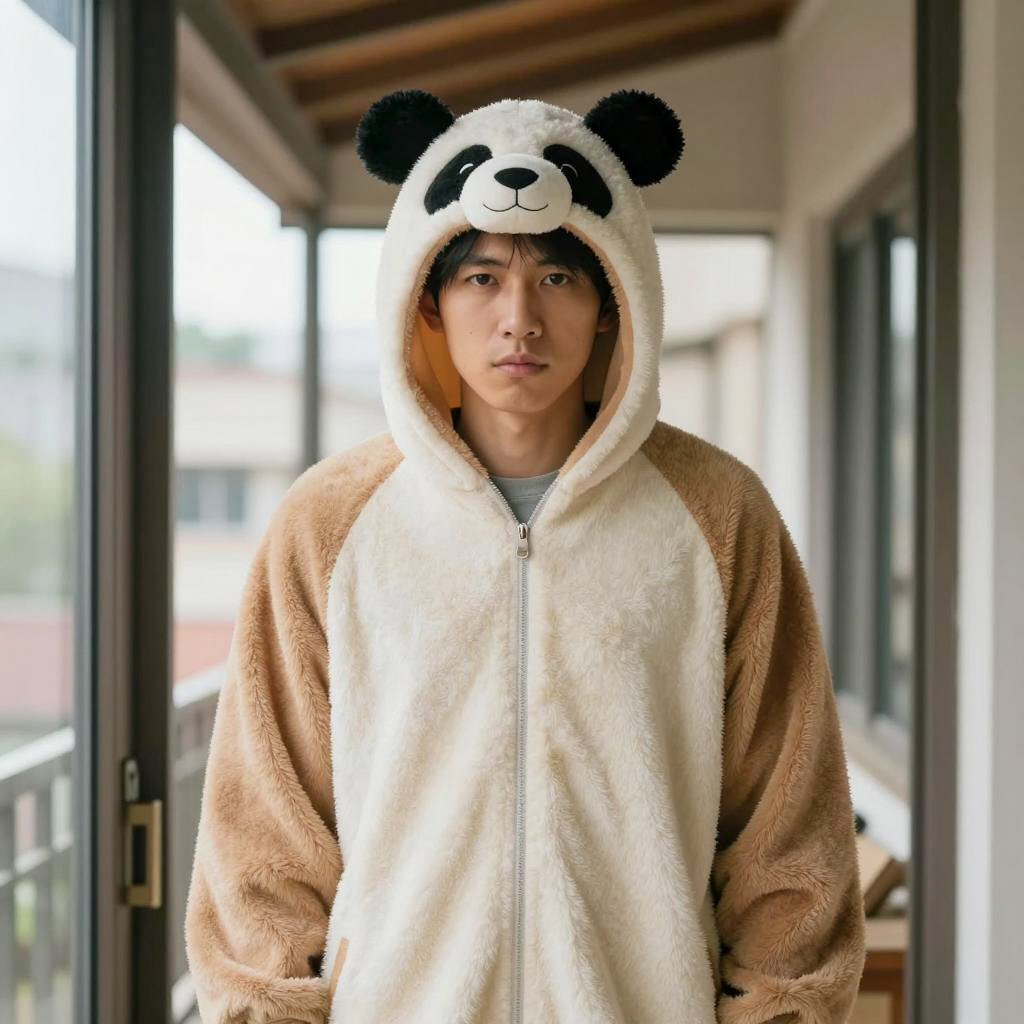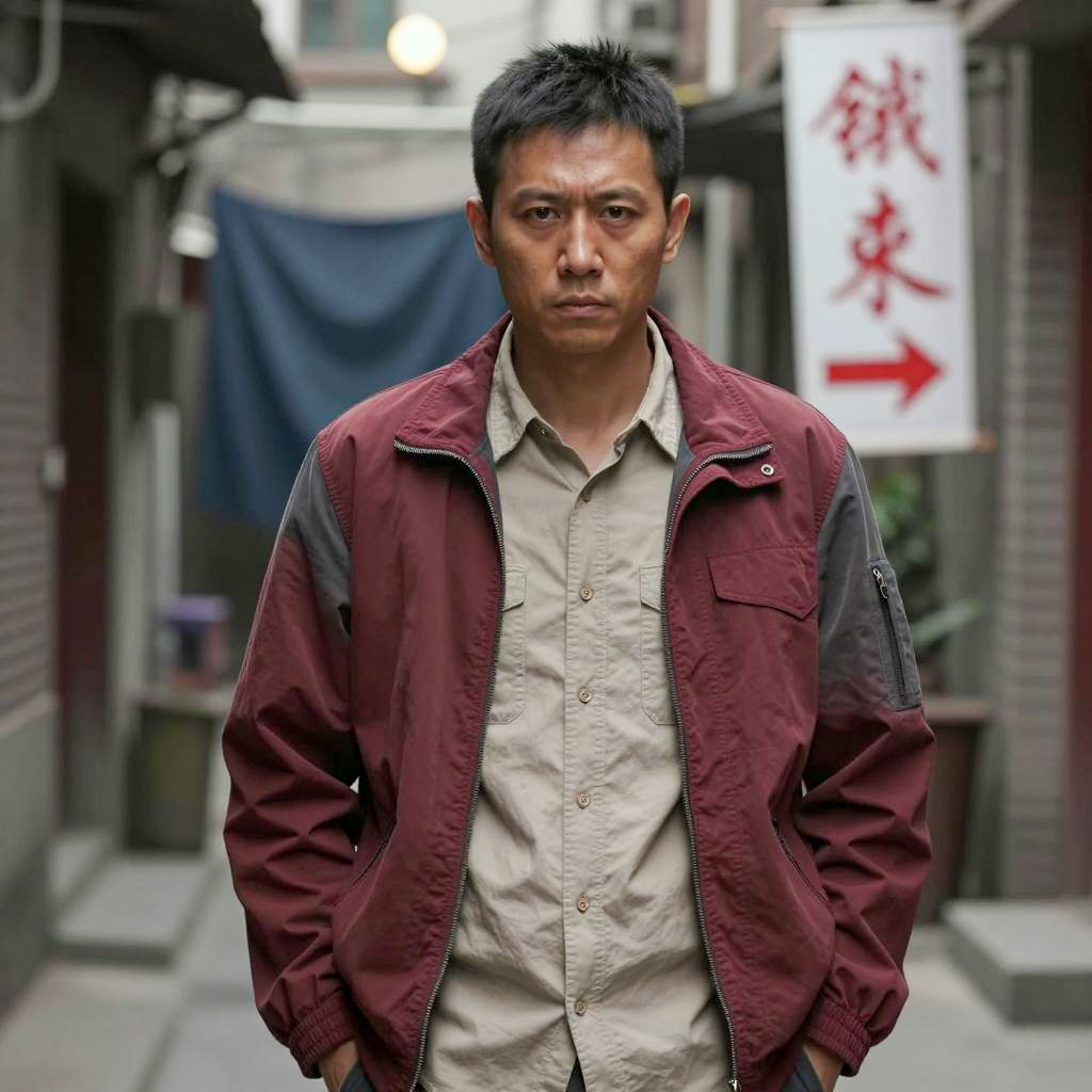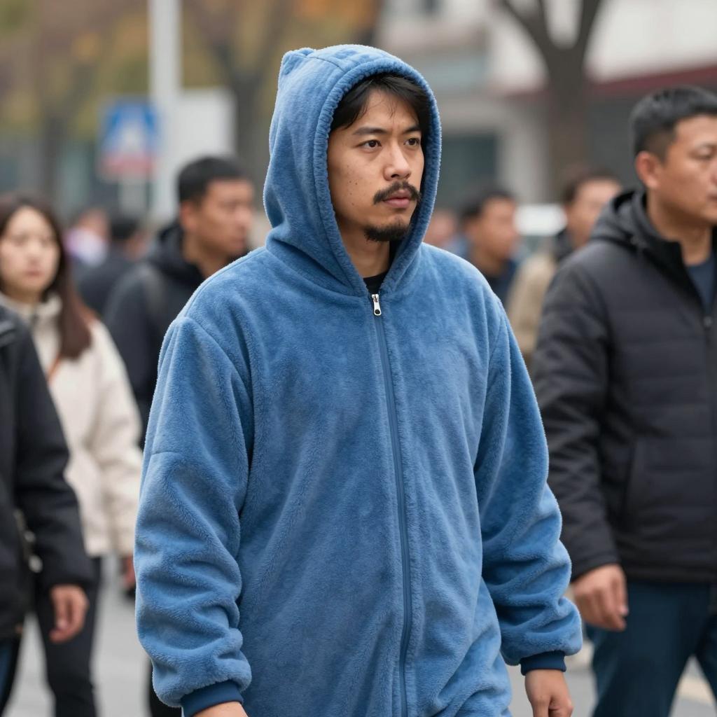 Candid street photo of an East Asian man wearing a blue hooded fleece jacket standing outdoors in a crowded urban area. The man has a mustache and short beard, and the background includes blurred pedestrians and autumn trees, indicating a cool weather setting.