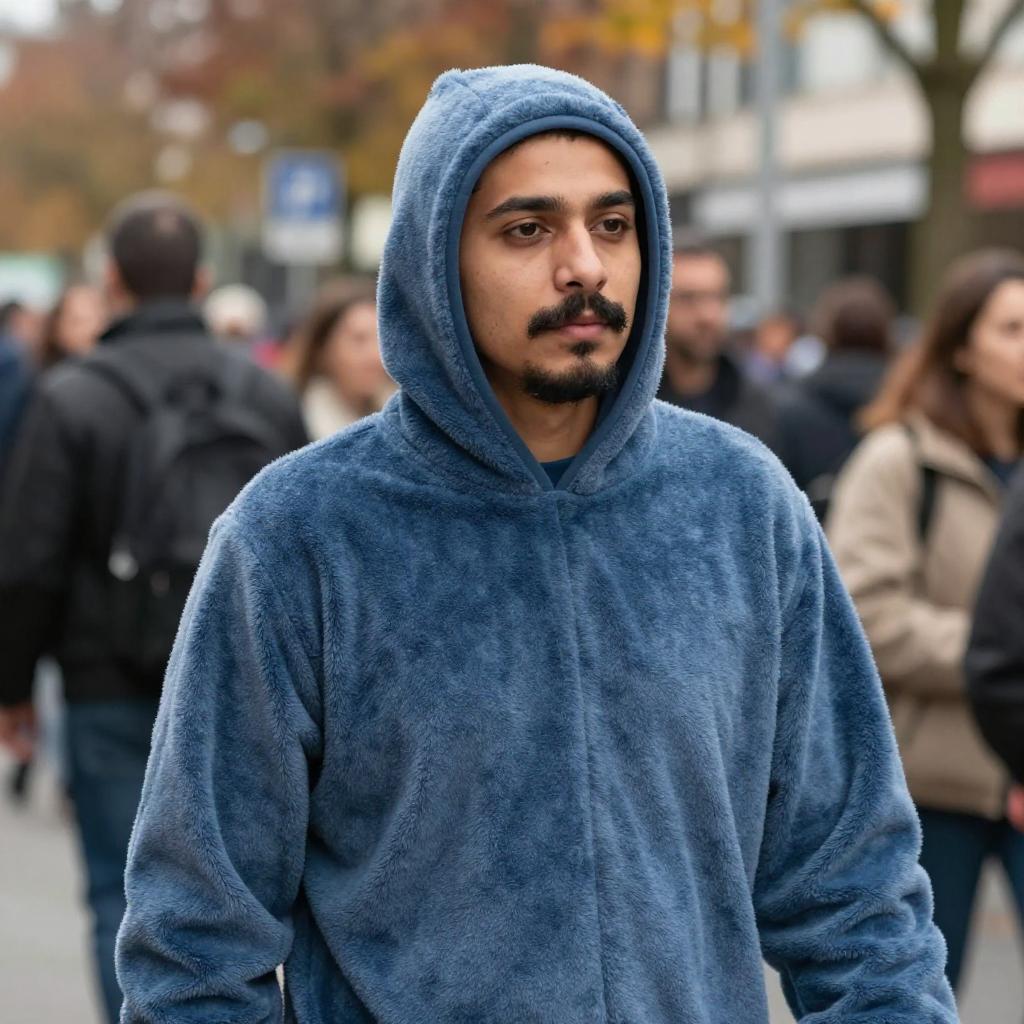 Candid street photo of a man wearing a blue thermal under clothes costume with a hood, standing outdoors among a crowd. The man has a mustache and beard, and the background features blurred pedestrians and autumn trees.