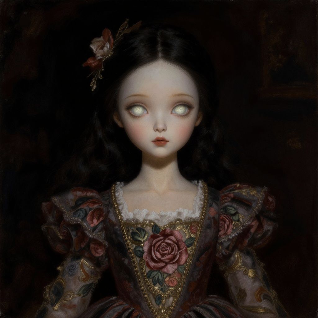 This is a digital painting of a porcelain-skinned, wide-eyed, young girl with glowing white eyes and dark, wavy hair. She wears an ornate, dark-colored dress adorned with intricate floral patterns, including red roses, and gold embroidery. A small, dark red flower rests on her hair to the left. The background is completely black, making her pale face and glowing eyes stand out starkly. The overall style is gothic and eerie, with a focus on delicate, detailed textures and a haunting, ethereal atmosphere.