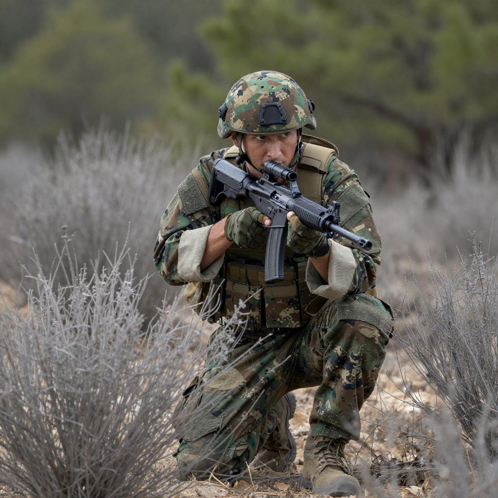 Crouching Soldier in Camouflage Composition