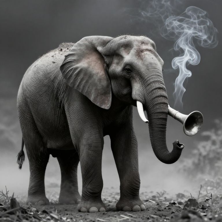 An elephant made entirely of smoke plays a musical instrument that whispers forgotten lullabies from extinct cultures.